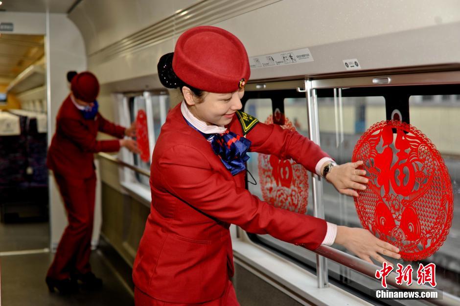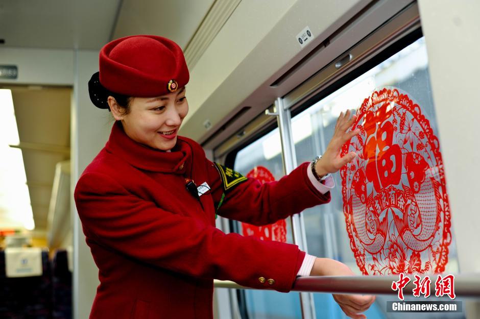 2014年春运来临前夕,南昌铁路局南昌客运段认真践行“安全、方便、温馨”出行的要求,积极为广大旅客营造温馨乘车氛围。图为1月14日,在南昌开往上海虹桥的D94次列车上,动姐们在车厢内张贴窗花,祈福旅客平安返乡。张学东 摄 |